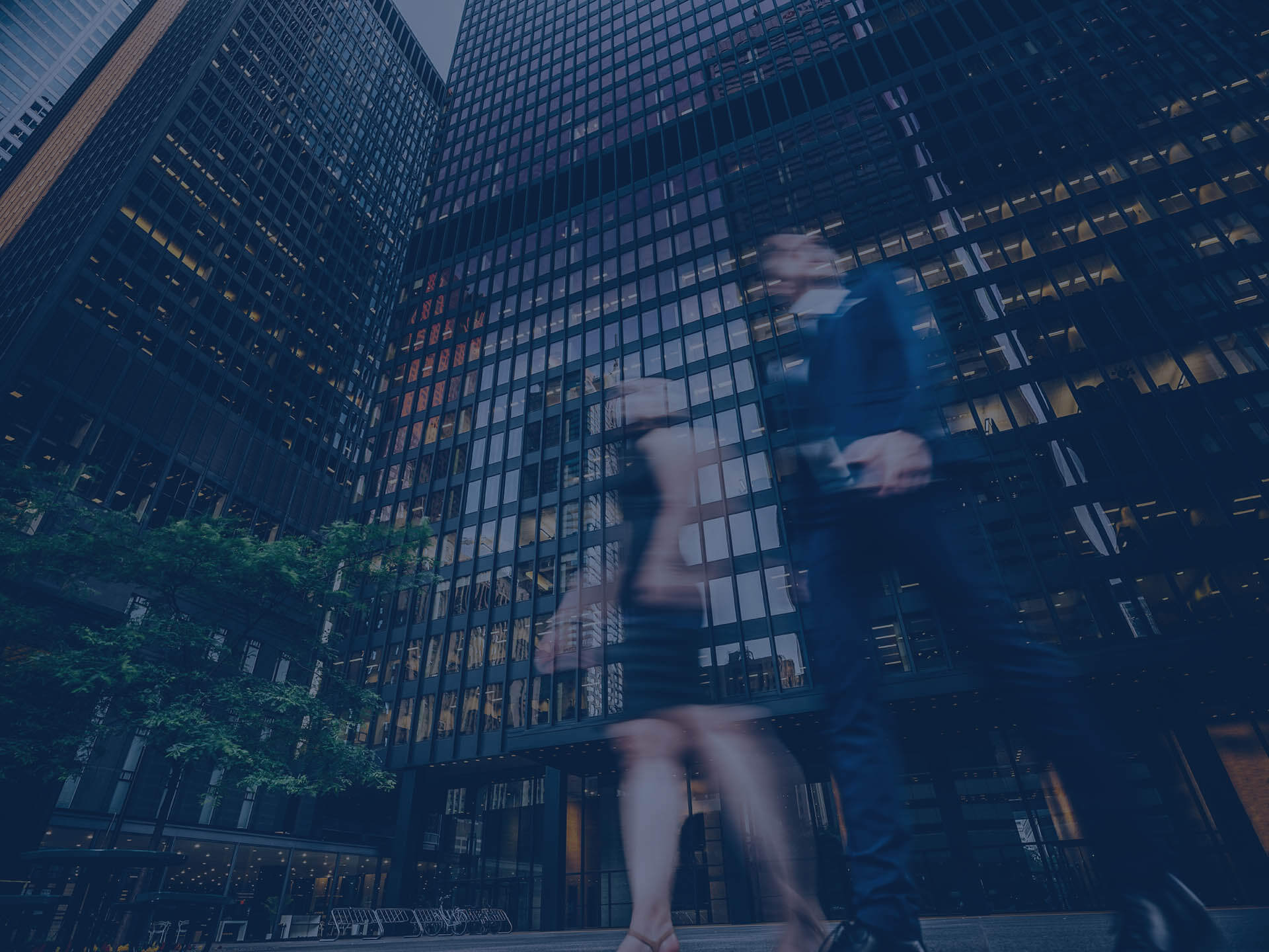 Two business people walking on downtown street. Blurred motion effect.
