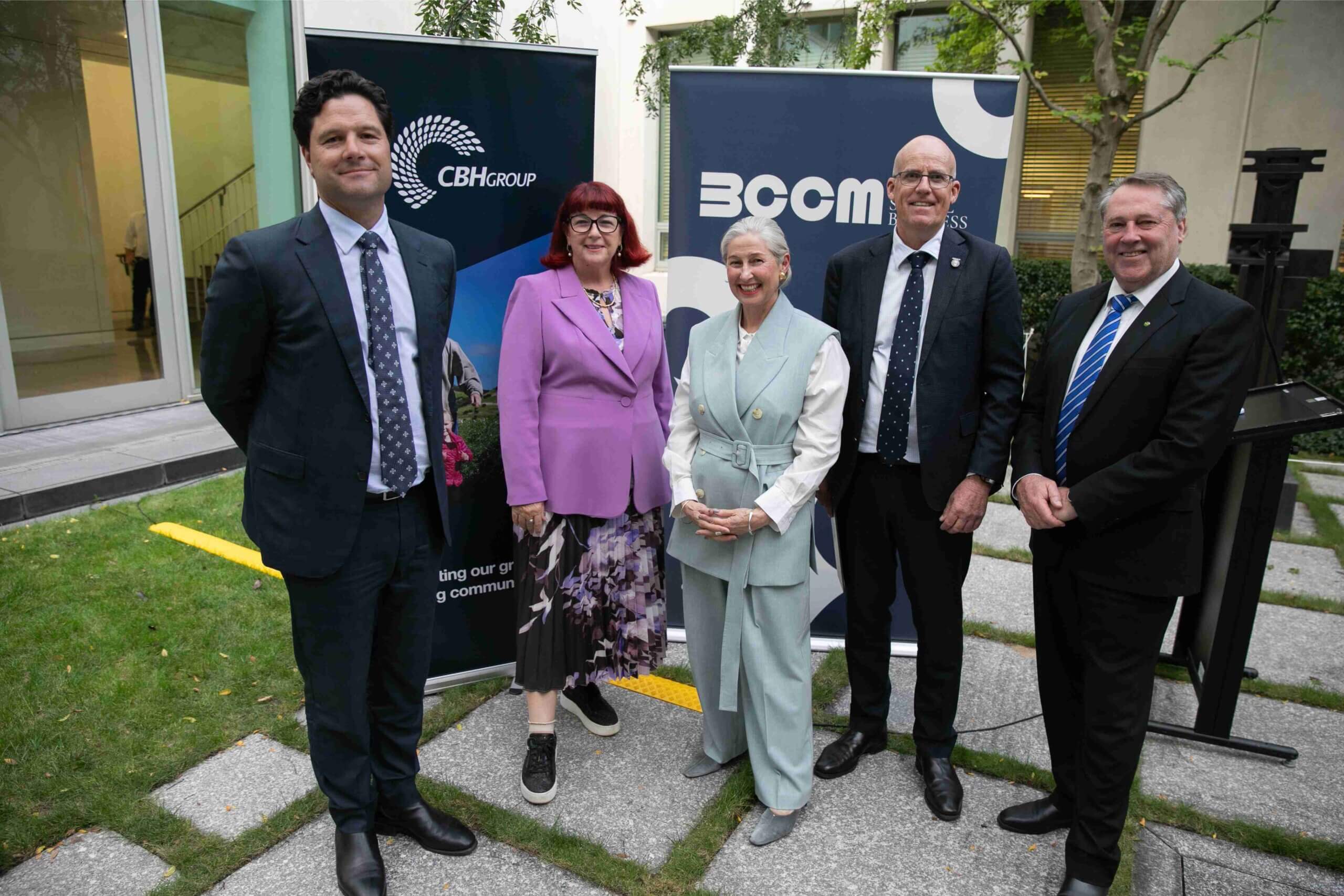 Ben Macnamara, CEO, CBH Group; Hon Melissa Price MP, Member for Durack; Melina Morrison, CEO, BCCM; Simon Stead, Chair, CBH Group; and Rick Wilson MP, Member for O’Connor.